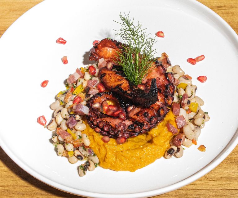 Octopus with black-eyed-pea salad, crispy pork belly, pomegranate, charred lemon.