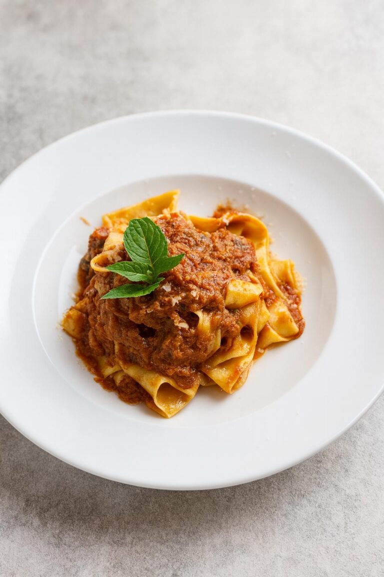 Traditional Albanian dish with tender beef, tomato, onions, garlic, peppers, ricotta.