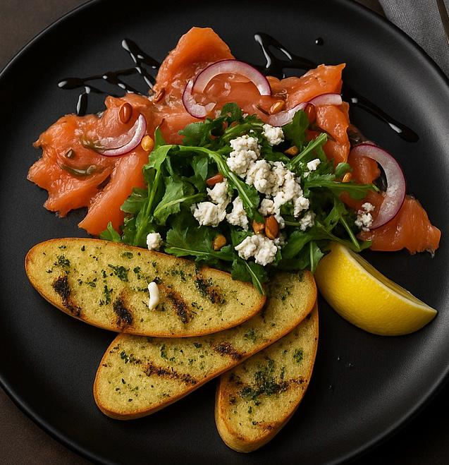 Grilled with tomatoes, olives, garlic confit, balsamic.
