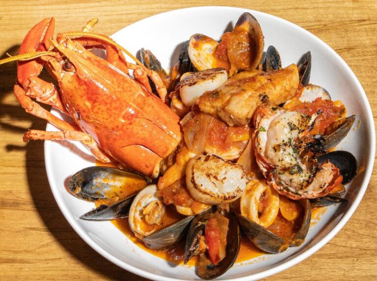 Halibut, shrimp, scallops, calamari, lobster, mussels in tomato broth.